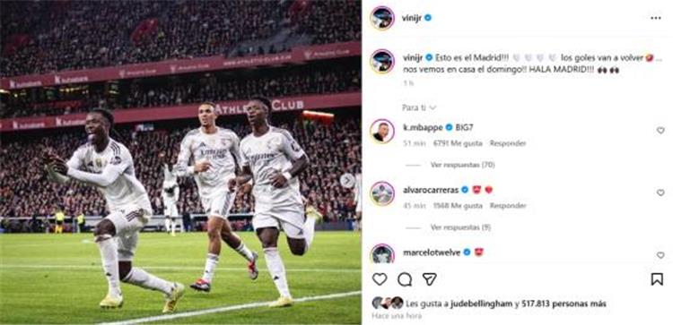 وأكمل: “الأهداف ستعود، نراكم في ملعبنا يوم الأحد.. هلا مدريد”، كما علق على هذه الصورة كلًا من كيليان مبابي وكاريراس وهويسن زملائه في الفريق.