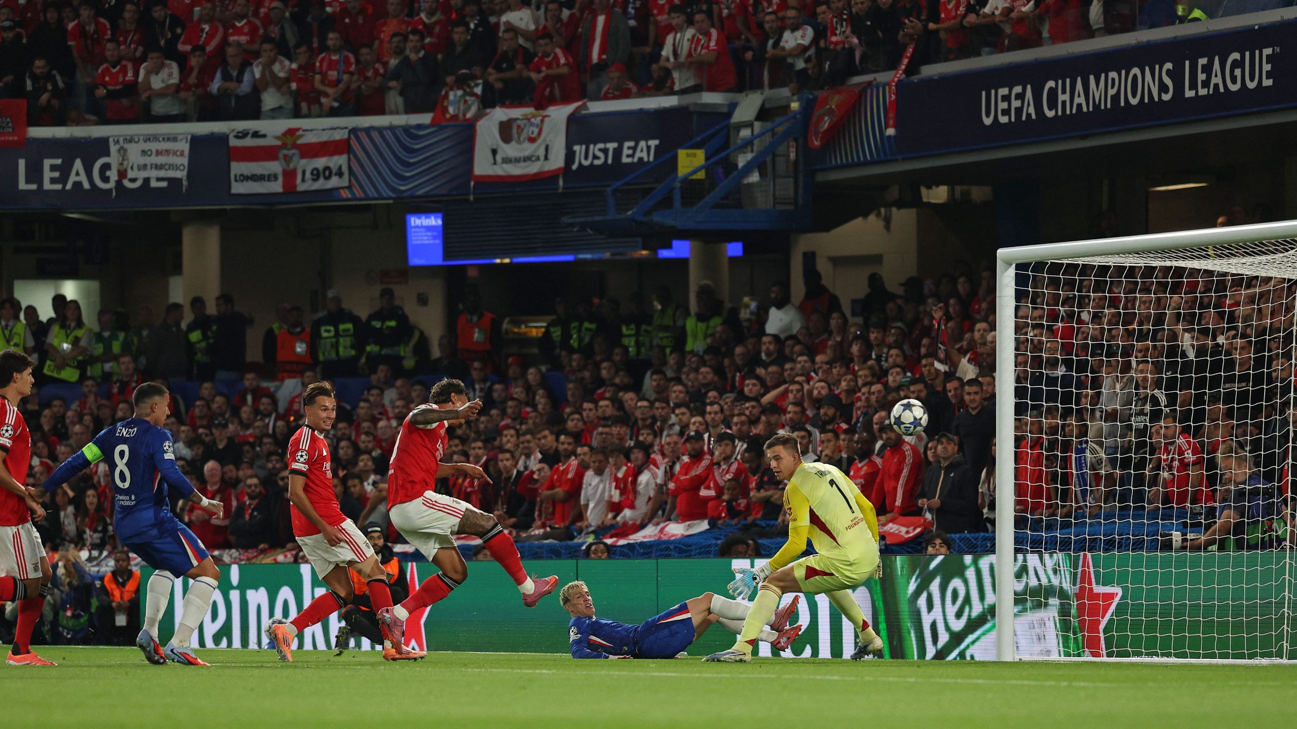 وكاد بنفيكا يصطاد شباك روبرت سانشيز من أول فرصة حقيقية، عندما تسلم لوكيباكيو تمريرة بينية داخل منطقة الجزاء، قابلها بتسديدة يسارية، فتحولت الكرة من يد سانشيز إلى القائم.