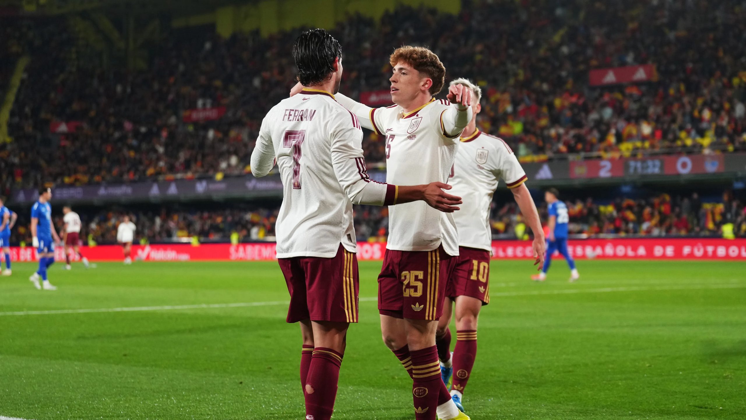 وسجل ميكيل أويارزابال، مهاجم ريال سوسيداد، هدفي المنتخب الإسباني في الدقيقتين 16 و44 من زمن الشوط الأول.