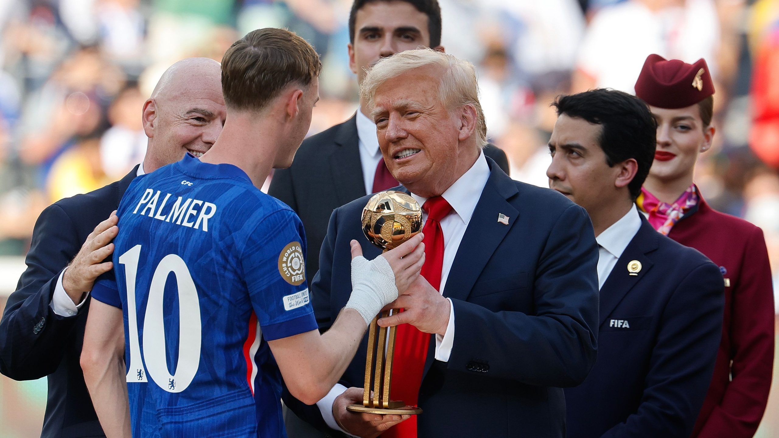 وقبل الواقعة، سلّم ترامب جائزة الكرة الذهبية إلى كول بالمر، الذي نالها بعد تتويجه كأفضل لاعب في مونديال الأندية، عقب أداء مميز ختمه بثنائية في النهائي.
