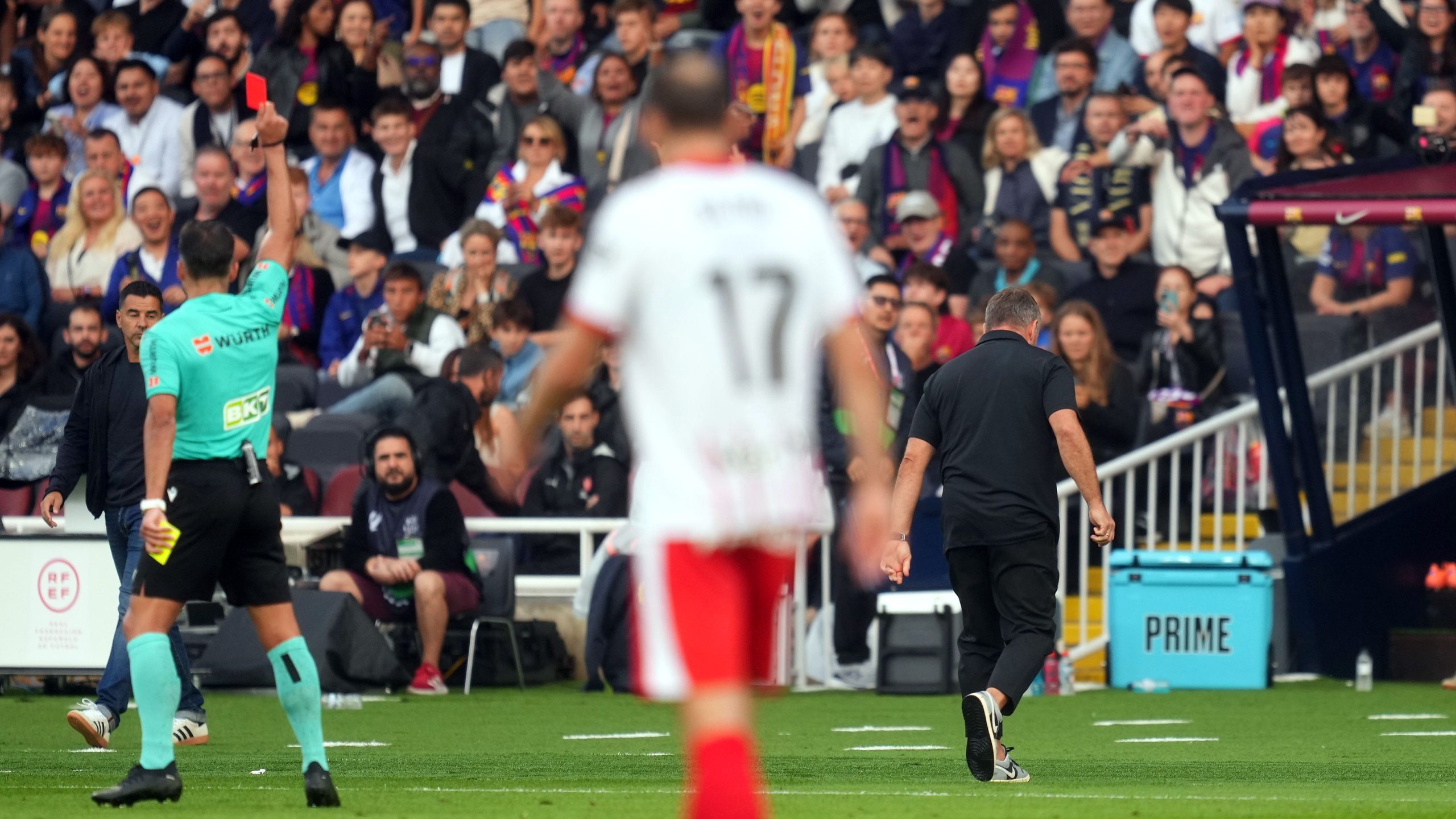 ولم تخلُ الدقائق الأخيرة من التوتر، إذ أشهر الحكم، البطاقة الحمراء في وجه المدرب الألماني هانز فليك، بعد احتجاجاته العنيفة على الوقت بدل الضائع، ليُكمل برشلونة، الدقائق الأخيرة دون مدربه على الخطوط.