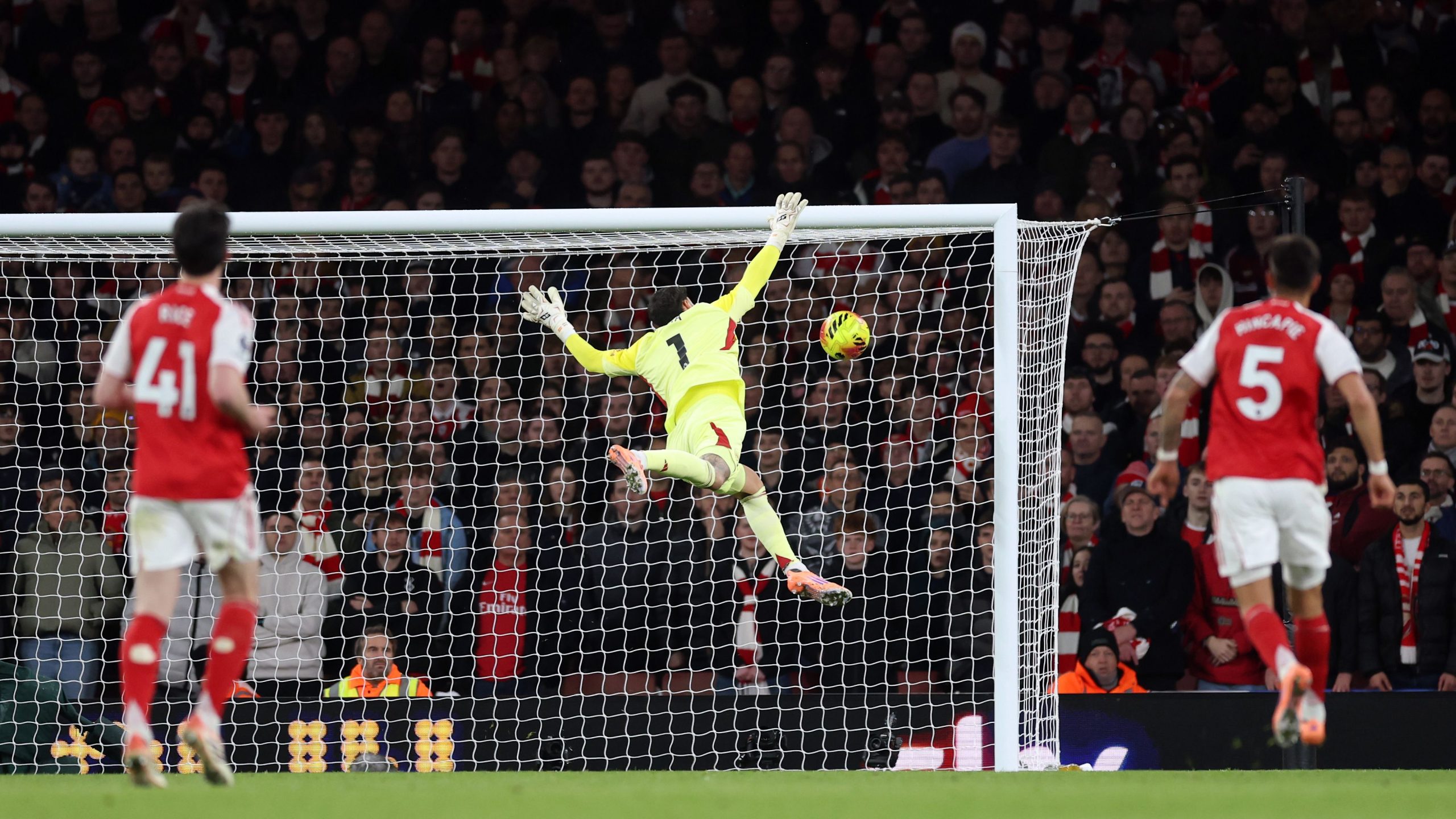 ووقف فيكاريو حائلا أمام عبور كرة سددها ساكا من ركلة حرة على حدود منطقة الجزاء، بتصديه لها بقبضتي يديه ببراعة.