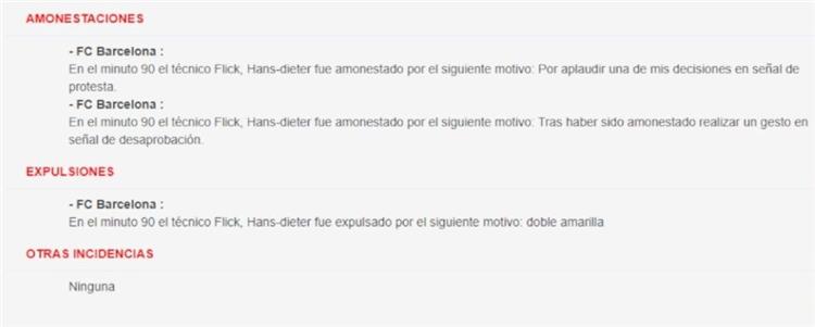 وجاءت لقطتا حصول هانز فليك على البطاقتين الصفراء والحمراء في الدقيقة 90 و92 احتجاجاً على قرارات جيل مانزانو، وجاءت البطاقة الصفراء الأولى لفليك بعد تصفيره على أحد قرارات مانزانو تعبيراً عن احتجاجه، وحصل المدرب على بطاقة صفراء ثانية بعد أن تم إنذاره مسبقاً حيث قام بحركة تشير لعدم موافقته.