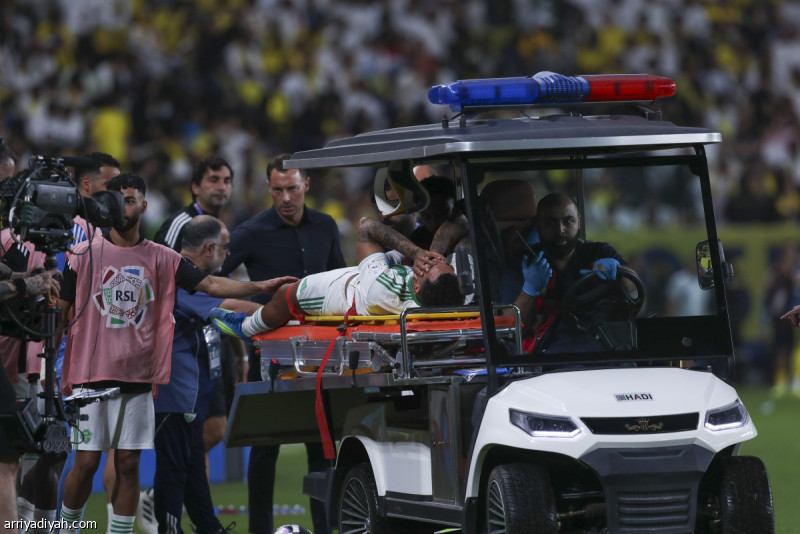 أنهى اصطدامٌ مع البرازيلي بينتو ماتيوس، حارس مرمى فريق النصر الأول لكرة القدم، حضور البرازيلي ويندرسون جالينو، جناح الأهلي، في الكلاسيكو، مساء الأربعاء، على ملعب «الأول بارك» في الرياض ضمن الجولة الـ 30 من دوري روشن السعودي.. وبدا جالينو متألمًا للغاية عقب سقوطه.. ودخل الجهاز الطبي لمعاينته ثم نقله إلى خارج المستطيل الأخضر مُتّجِهًا به إلى غرفة الملابس.. وفي الدقيقة 64، أدخل الجهاز الفني الأهلاوي المهاجم فراس البريكان بدلًا من البرازيلي. تصوير: فهد المري