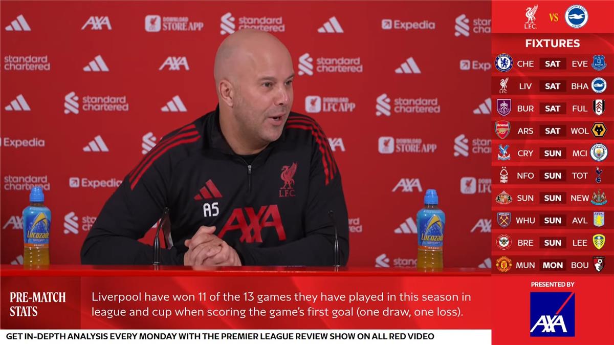 عقد آرني سلوت مدرب ليفربول مؤتمرًا صحفيًا للحديث عن استعدادات فريقه لمواجهة برايتون، على ملعب آنفيلد غدًا السبت في الدوري الإنجليزي الممتاز.