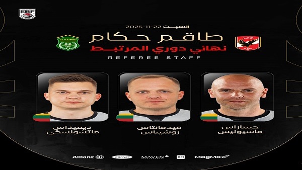 أعلن الاتحاد المصري لكرة السلة برئاسة الاستاذ عمرو مصيلحي، عن طاقم تحكيم نهائي دوري المرتبط لكرة السلة للرجال، والذي يجمع بين الأهلي والاتحاد السكندري حيث يقام اليوم السبت مباراة الذهاب، على صالة زويل بمدينة السادس من أكتوبر.