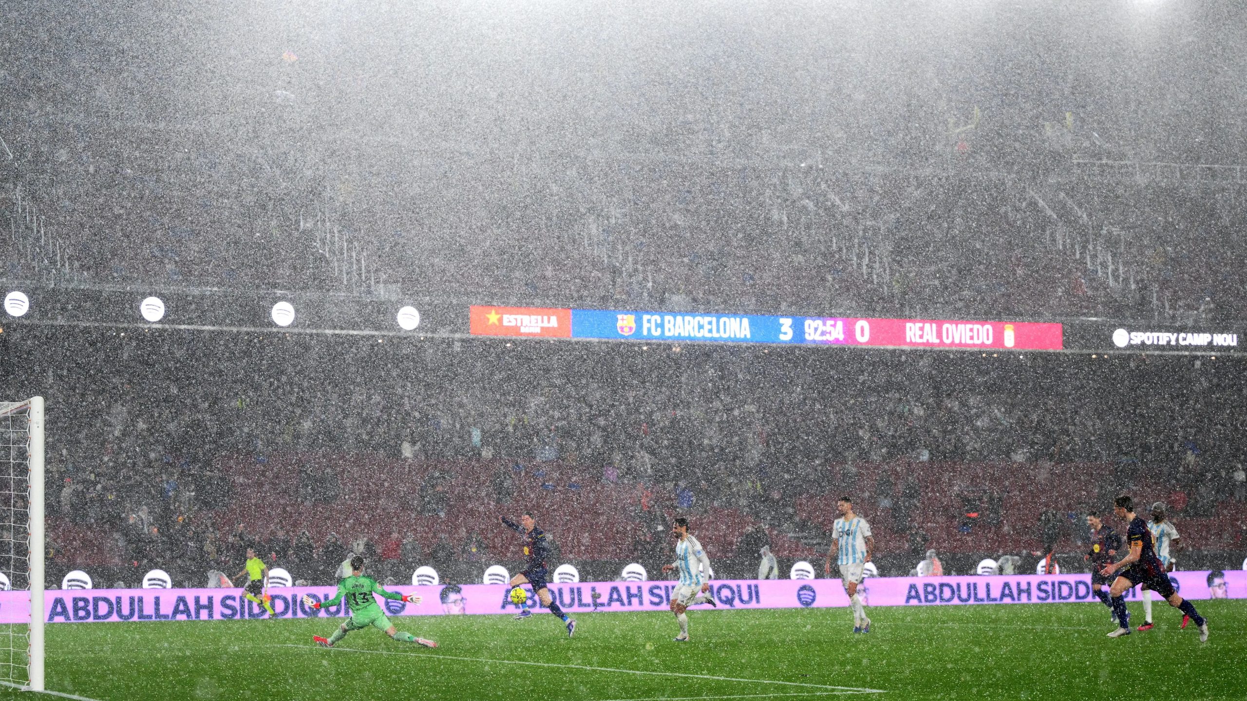 شهدت مباراة برشلونة وريال أوفييدو، مساء اليوم الأحد، تساقطا غزيرا للأمطار، لم تتحمله بعض مرافق ملعب “كامب نو”.