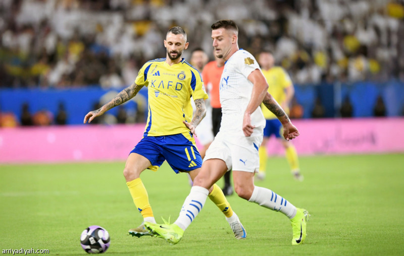 الصربي سيرجي سافيتش لاعب الهلال في صراع على الكرة مع الكرواتي مارسيلو بروزوفيتش لاعب النصر خلال مواجهة الفريقان الدور الأول الموسم الماضي تصوير : يزيد الضويحي