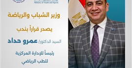 وتتطلع الوزارة إلى توظيف خبراته المتميزة في الإدارة المركزية للطب الرياضي، بما يعزز تطوير خدمات الرعاية والتأهيل الطبي للرياضيين، ويدعم البناء المؤسسي للقطاع الطبي بالوزارة، ويواكب خطط الارتقاء بالمنظومة الرياضية على مستوى الجمهورية.