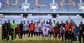 ورفع لاعبو الفريق والجهاز الفني والإداري والطبي قميص رمضان صبحي قبل انطلاق المباراة لدعم نجم الفريق.