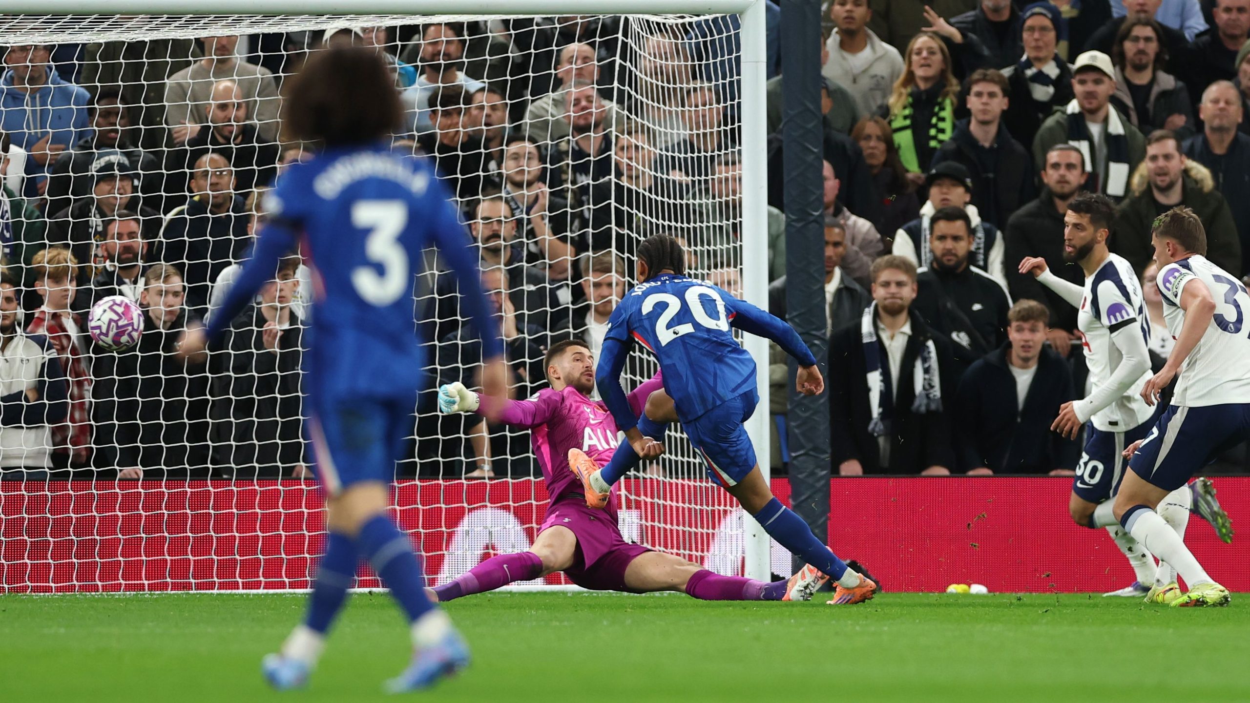 وفي الوقت المحتسب بدل الضائع، كاد توتنهام هوتسبير أن يعادل النتيجة عبر تسديدة خطيرة من قدوس داخل منطقة الجزاء، لكن سانشيز أنقذ مرماه ببراعة بتصديه لها، لينتهي الشوط الأول بتقدم البلوز (1-0).