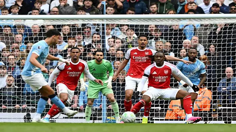 الديقة 69: تسديدة من رودري لاعب مان سيتي تصطدم بدفاعات أرسنال